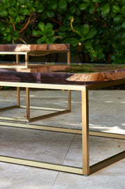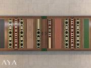 صُنعت طاولة لعب الورق هذه يدوياً بمواصفات خاصة، وتأتي مزدانة بنقشة مُطعمة تستعرض مشاهد خارجية من مدينة الدرعية بجمالها الأصيل. تتركز النقشة على شكل إطار خارجي بديع بتصميم هندسي متداخل وألوان متناغمة. وقد اُستوحيت الألوان من مختلف العناصر والتخخخخدريجات اللونية التي تتميز بها الدرعية. صُممت هذه القطعة لتتيح جلوس أربعة لاعبين، وقد زُوِّدت بدُرج يمكن لكل لاعب وضع أغراضه الشخصية فيه إلى جانب حامل كوب في كل ركن من أركان الطاولة. ويتوسط سطح الطاولة مساحة مكسوة بالمخمل الأخضر الداكن لوضع بطاقات اللعب عليها بسلاسة.