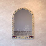 A beautiful Arabian console mirror that fits in any contemporary home. The mirror is an art piece on its own as it has multiple techniques within it. The mirror consists of a v-groove carving technique depicting two horses and their owner; a story share throughout the Faras Collection.